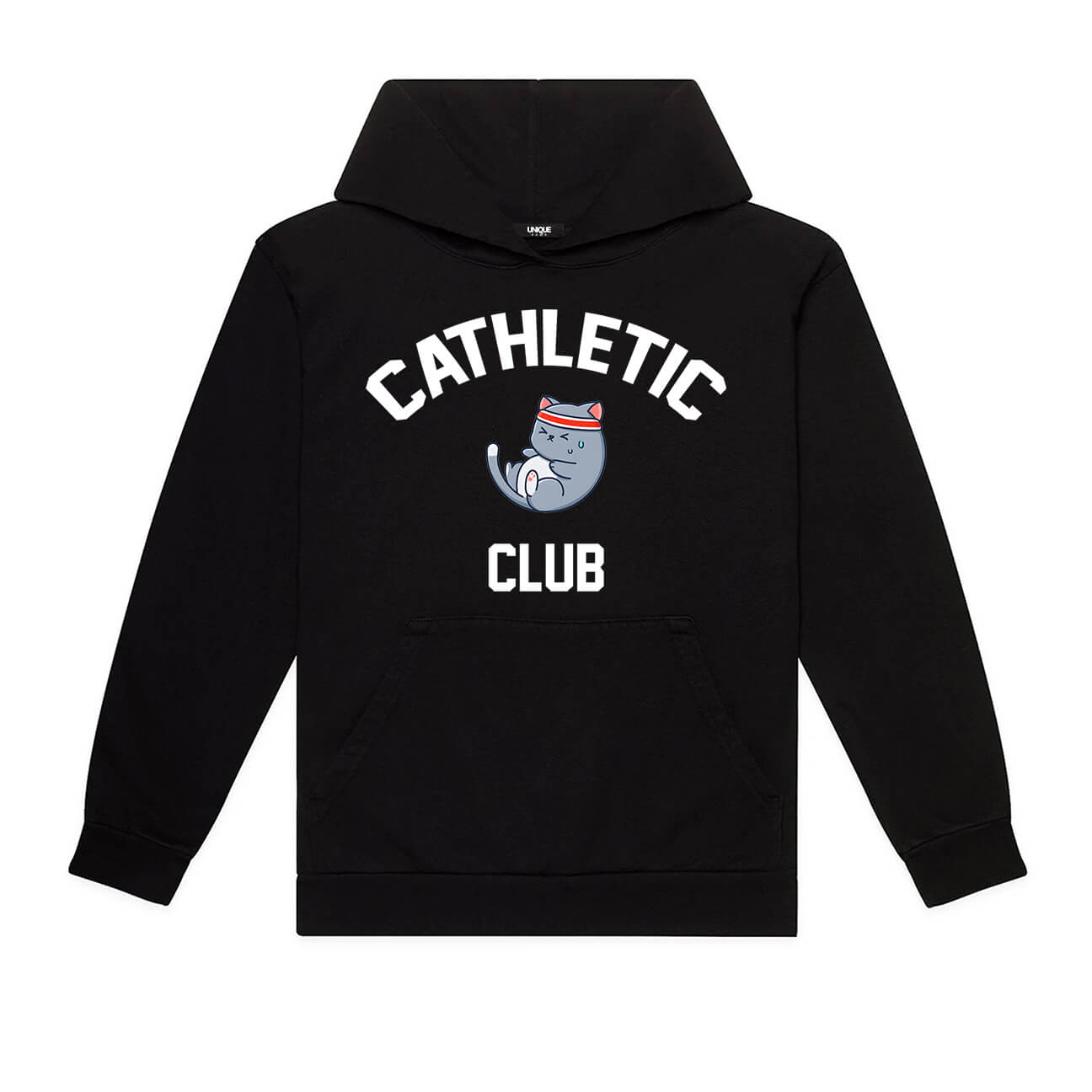 Be the envy of everyone in the gym in the Cathletic Club hoodie! This funny hoodie is purr-fect for cat and fitness lovers alike; show off your sense of humor and athletic skill in this crazy combo pun. Let everyone know that you're part of the "meow-vement" and that you work (out) hard for those muscle gains!