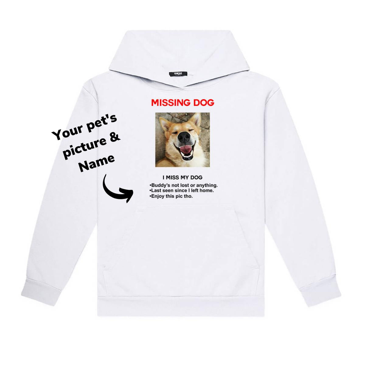 Unit price perAin't no thang when your pet's up and vanished - keep your cool and spread the humor with our unique Missing Pet Custom Hoodie! It's the purrfect addition to your wardrobe for pet owners who want to crack a grin or who just can't stand to be apart from their fluffy pals!