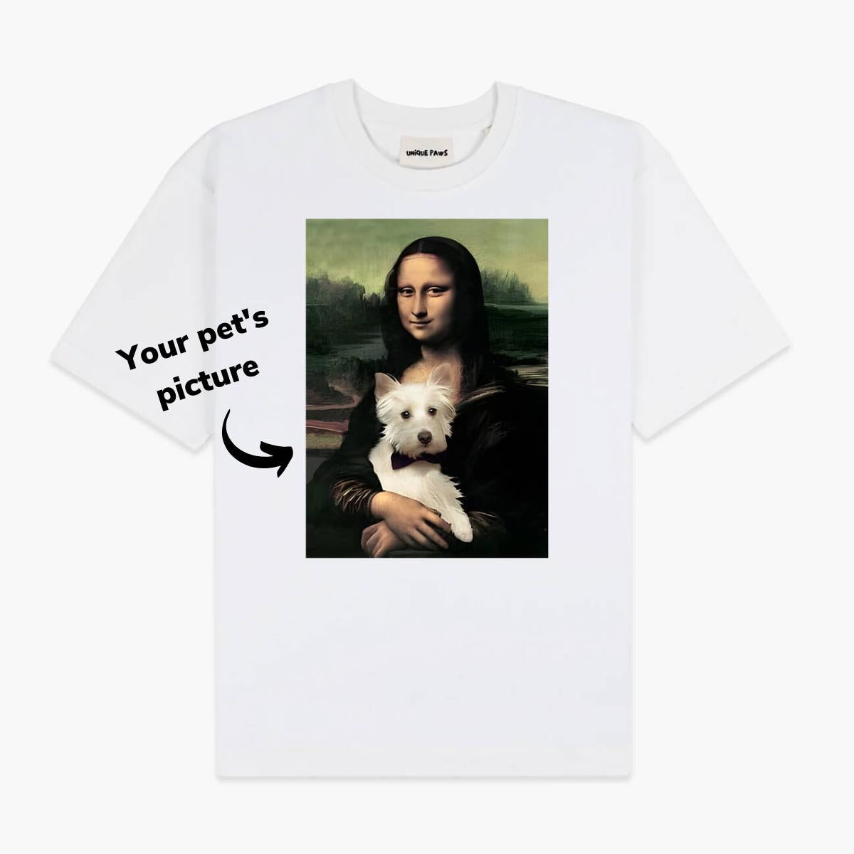 Experience the classic beauty of the Mona Lisa like never before - personalized with your furry best friend! Create a one-of-a-kind custom t-shirt with Mona and your pet, perfect for an art lover (with a sense of humor). Your pet never looked so good! 🎨