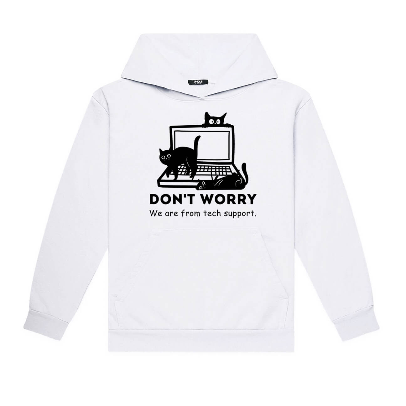 Never worry about tech support again with this "Don't worry, we are from tech support" Hoodie. It's perfect for the cat-loving tech-savvy person who loves to have a bit of fun. Featuring cats on laptops, this funny t-shirt is sure to get a few chuckles! Who said tech support can't be purrr-fect?