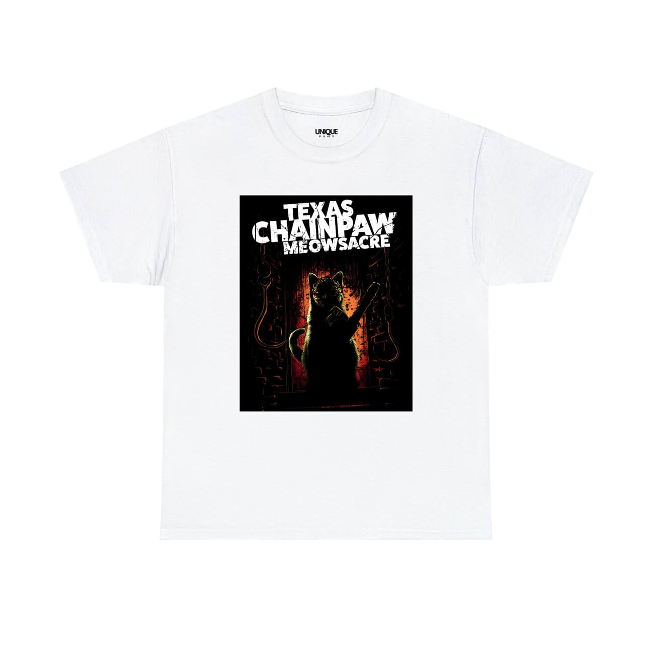 Make your friends meow with laughter in this Texas Chainpaw Meowsacre t-shirt! A purr-fectly punny play on words, this funny t-shirt is sure to be a hit with any horror movie fan. (Don't worry, 100% paw-sitively no cats were harmed in the making of this shirt!)