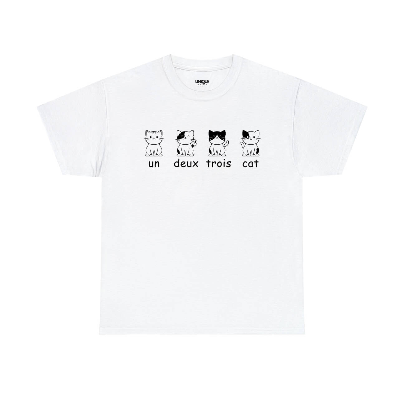 Say "meow" to perfect fashion! Our Un Deux Trois Cat T-Shirt features a fun feline design, guaranteeing you'll look purr-ty fantastic! Rock this shirt while mousing around town or sittin' at home. So, don't just be a cat-napkin, show off your fashion sense with this cool cat!