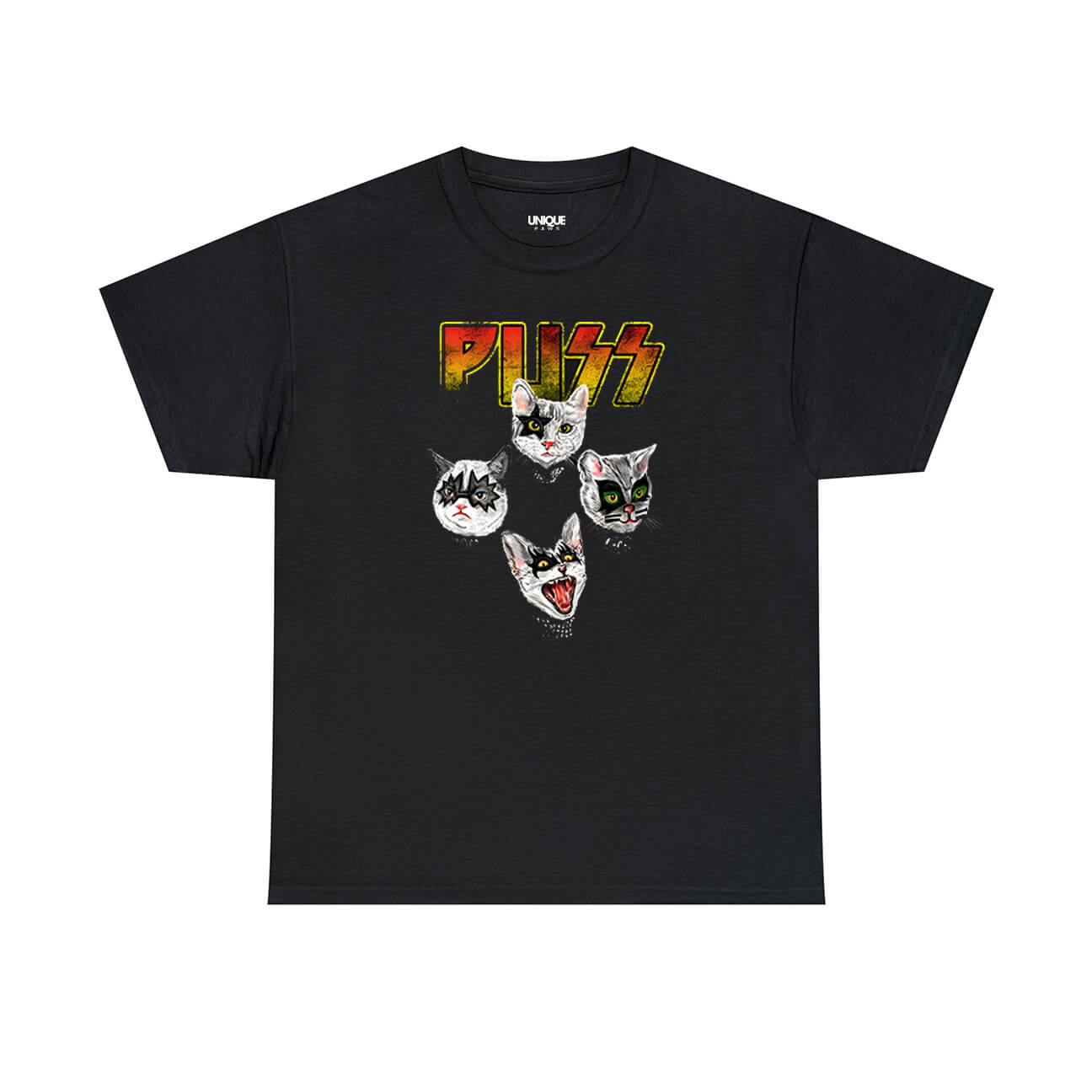 Calling all cat lovers and KISS fans alike! Show your love of both with this cool PUSS T-Shirt featuring a funny cat inspired by the rock band. Featuring a soft, durable fabric and classic style, rock out in style with this purr-fectly fun t-shirt! (Meow!)